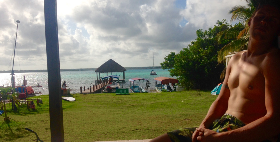 In Bacalar we stayed in Green Monkey hostel, which was basic but fantastically located right on the lagoon. We were sleeping in a converted school bus which was an exciting novelty and surprisingly comfortable with the breeze wafting through. We encountered another pair of Brits - Arthur and Alice - with whom we took a boat trip out on the lagoon to see some cenotes (big sink holes) and to witness the lagoon of seven colours up close. The varying blues and greens of the water were breathtakingly beautiful, and we had a lovely half an hour on a sandbank in the middle of the lagoon where we swam and jumped off a big concrete structure like excitable children.